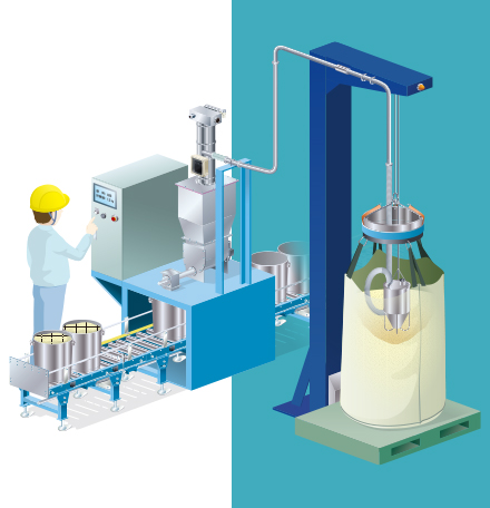 紙袋の粉体原料を吸引式空気輸送機で吸引し、減算式で自動計量し、ミキサーなどに投入する装置です。 原...